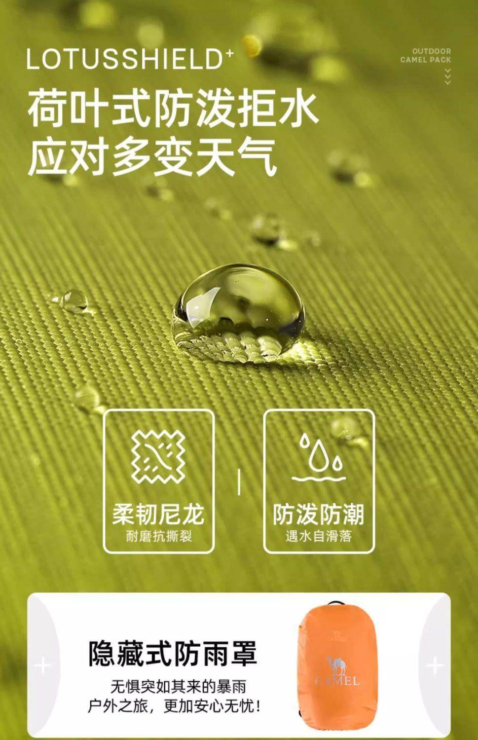 吴先生介绍,他于6月13日凌晨在骆驼男装旗舰店,发现一款骆驼户外登山包男女新款专业徒步背包防水旅行双肩包,该产品宣传页面上显示“荷叶式防泼拒水”“应对多变天气”“无惧突如其来的暴雨”,因自己需要一个防水的登山包,他便拍下了该包。