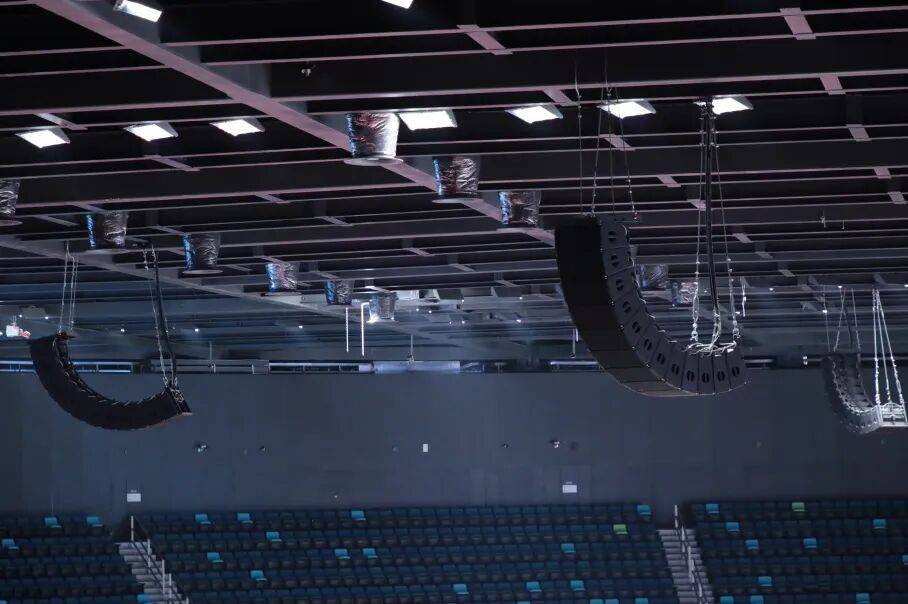 综合体育馆建筑面积约11万平方米,是国内规模领先、设施先进的综合性多功能体育馆之一,可承接篮球、冰球、羽毛球、体操等20余项国际标准体育赛事,同时适配各类高能级文化演艺活动,对音频系统的兼容性、稳定性与音质表现提出极高要求。结合场馆实际场景,项目面临三大核心挑战:一是场馆体积庞大,混响时间偏长,需保障扩声设备具备大功率、高灵敏度及长距离投射能力;二是地处海边,高湿度、高盐碱环境对设备的耐候性构成考验;三是观众区呈梯形分布,要求扩声系统具备精准的指向性控制,确保声场均匀覆盖。